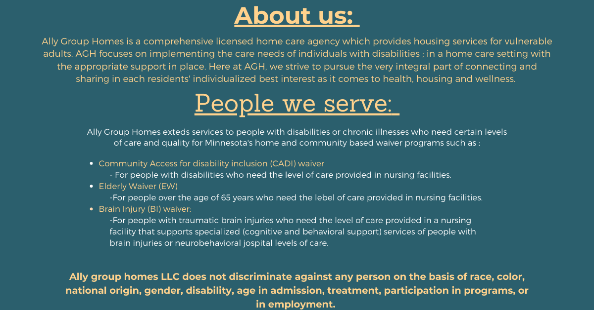 Ally Group Homes is an Assisted Living/CRS agency which provides housing services for vulnerable adults. AGH focuses on implementing the care needs of individuals with disabilities ; in a home care setting with the appropriate support in place.
