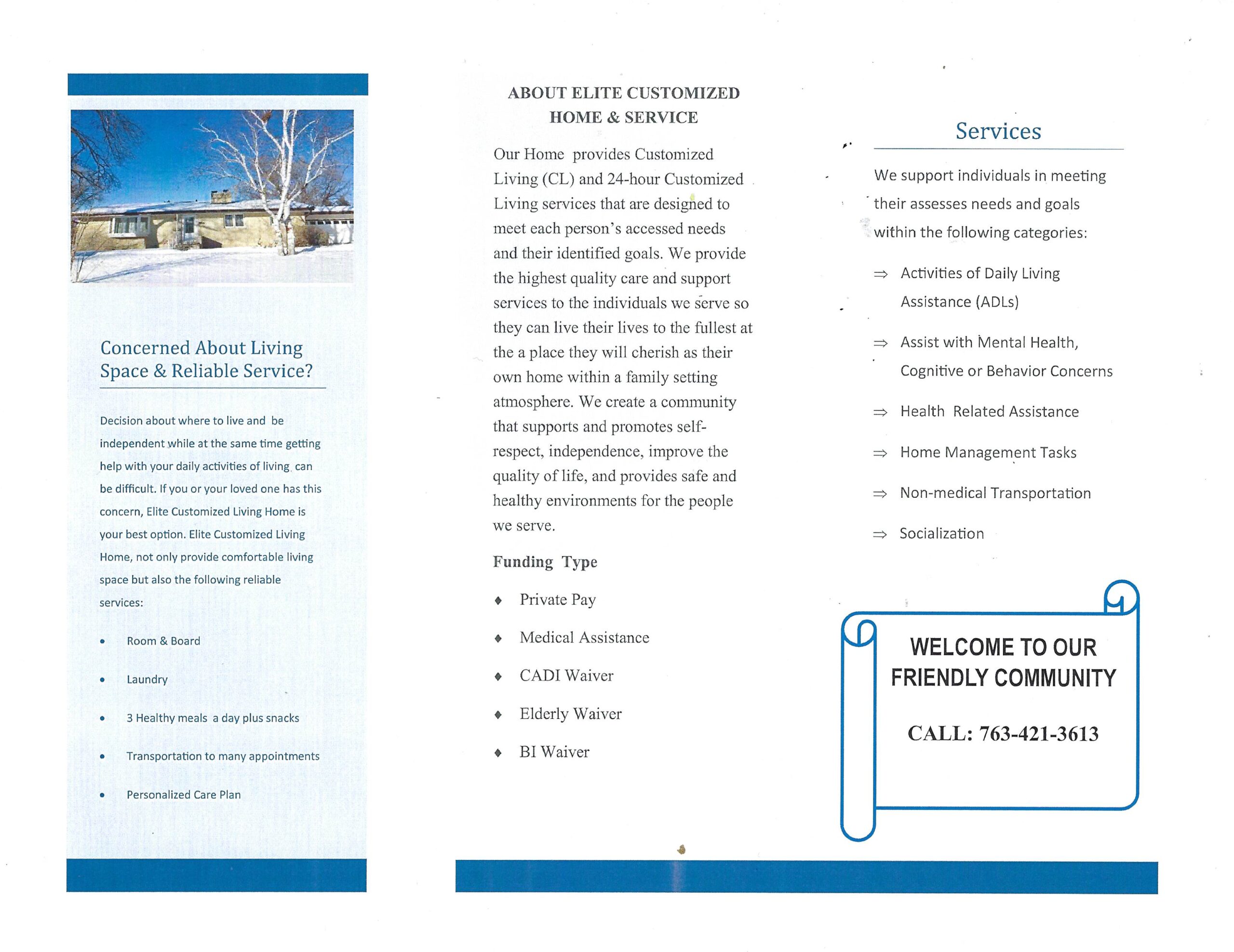 Our Home is located in a quiet neighborhood of Thurber Road in Brooklyn Center with private bedrooms and television for each person served. We provide Customized Living (CL) and 24-Hour Customized Living services that are designed to meet each person’s accessed needs and their identified goals. We provide the highest quality care and support services to the individuals we serve so they can live their lives to the fullest at a place they will cherish as their own home with a family setting astrosphere. We create a community that supports and promotes self-respect, independence, improve the quality of life, and provides safe and healthy environments for the people we serve.