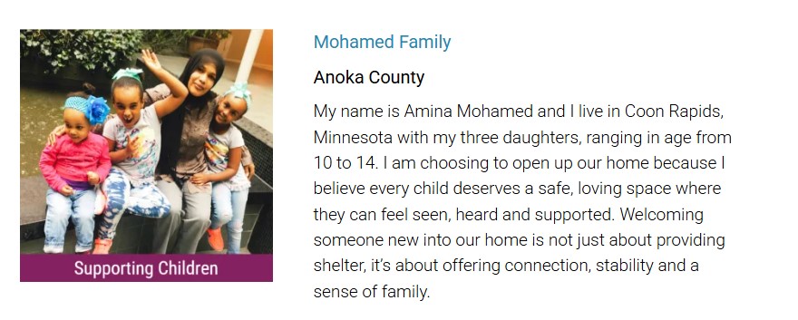 My name is Amina Mohamed and I live in Coon Rapids, Minnesota with my three daughters, ranging in age from 10 to 14. I am choosing to open up our home because I believe every child deserves a safe, loving space where they can feel seen, heard and supported. Welcoming someone new into our home is not just about providing shelter, it’s about offering connection, stability and a sense of family.